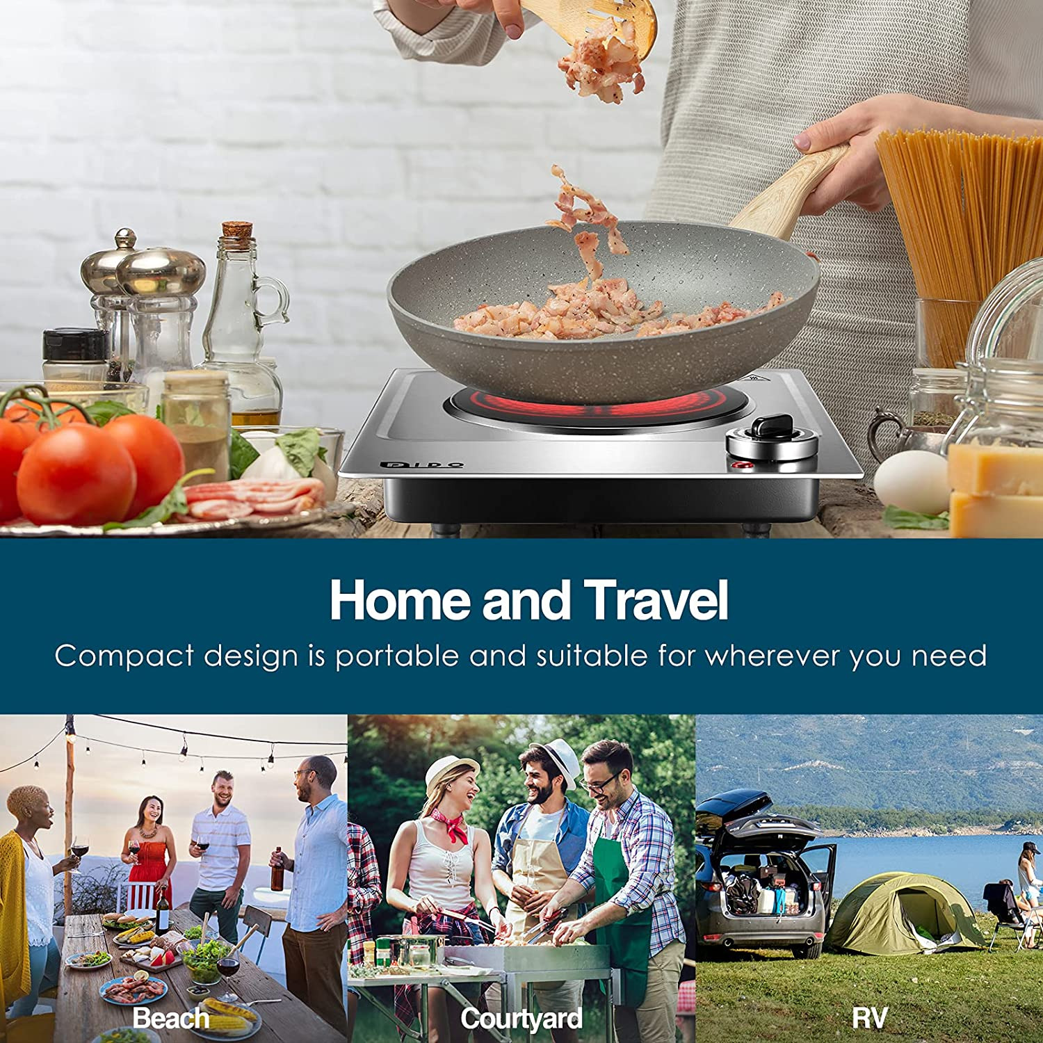 【POWERFUL & MULTIFUNCTION】1200W infrared burner and sleek crystallite ceramic heating surface ensure super-fast heating and even heat distribution with consistent temperature output. Lights indicate that the burner is on and you can cook a meal from scratch, warm leftovers, or keep food hot for an extended duration.【ALL TYPES OF COOKWARE】The hot plate works from aluminum cookware to copper jam pots, glass pot, tea kettles and nonmagnetic stainless steel pans in diameter of 4’’-7.4’’ across, almost without any cookware restrictions. Conveniently cooks a variety of foods, such as boiling water,reheating sauces, making soups, frying steak, cooking pasta,grilling cheese and vegetables, and more.