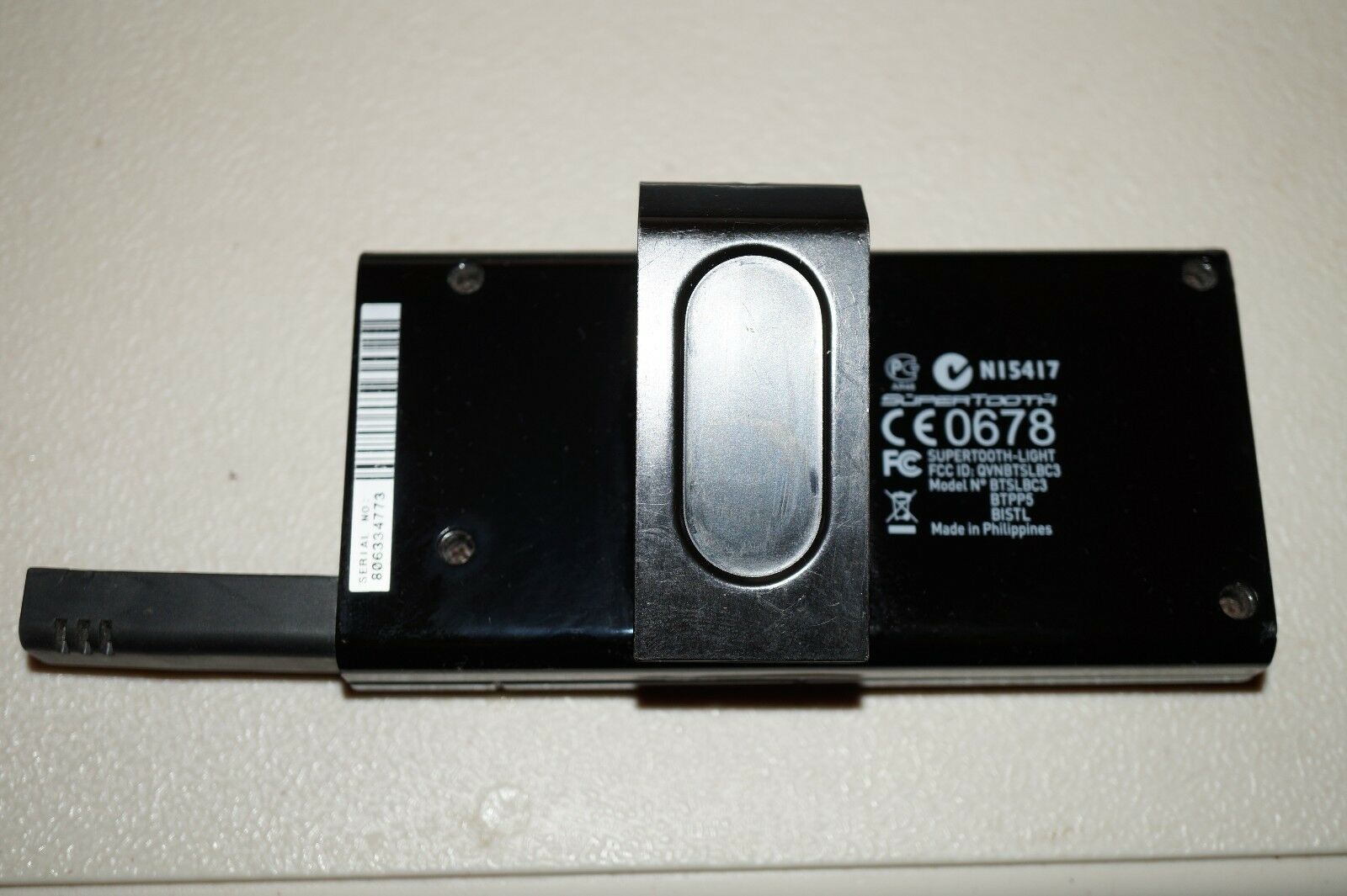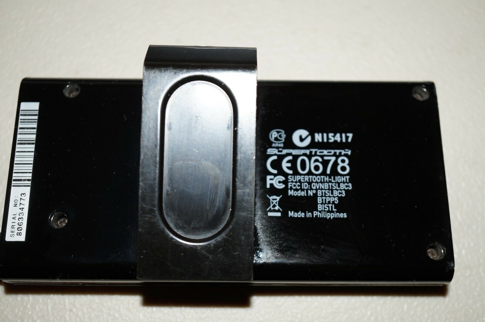BlueAnt Supertooth Light BTSLBC3 Bluetooth SpeakerphoneSeems to work fine except that the antenna won't stay in, so it cannot be turned off without physically holding the antenna in. Would be good for parts or repair. Comes with visor clip.